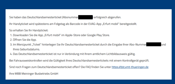 You have successfully retrieved the Germany Semester Ticket (subscription number [redacted]). Your mobile ticket will be made available as a barcode in the EVAG app “Erfurt mobil” by the following day at the latest. How to access your mobile ticket: