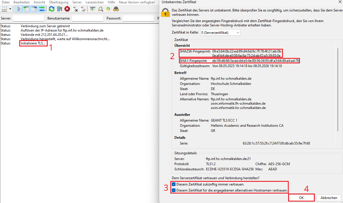 Nachdem Sie die Fingerprints überprüft haben, können Sie dieses Zertifikat für die Zukunft als vertrauenswürdig markieren (3) und über den Button OK