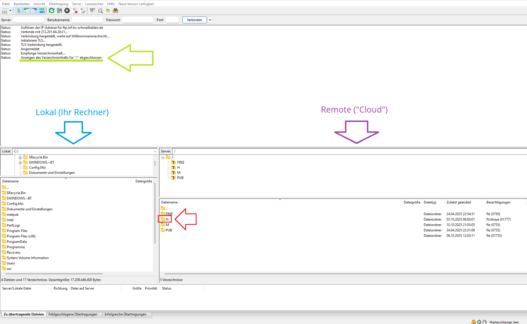Sie bekommen die Meldung Anzeigen des Verzeichnisinhalts für „/“ abgeschlossen angezeigt, sobald die Verbindung erfolgreich hergestellt wurde. Auf der linken Seite finden Sie nun die Dateistruktur auf ihrem lokalen Rechner. Auf der rechten Seite werden Ihnen die Dateien und Ordner angezeigt, die sich auf dem Server der Fakultät befinden. Dort finden Sie auch ihr persönliches Home-Verzeichnis unter dem Buchstaben H.