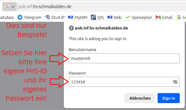 Das PUB-Verzeichnis steht als Website unter https://pub.inf.hs-schmalkalden.de zur Verfügung. Diese Website erfordert eine Anmeldung mit Ihrer FHS-ID und Passwort: