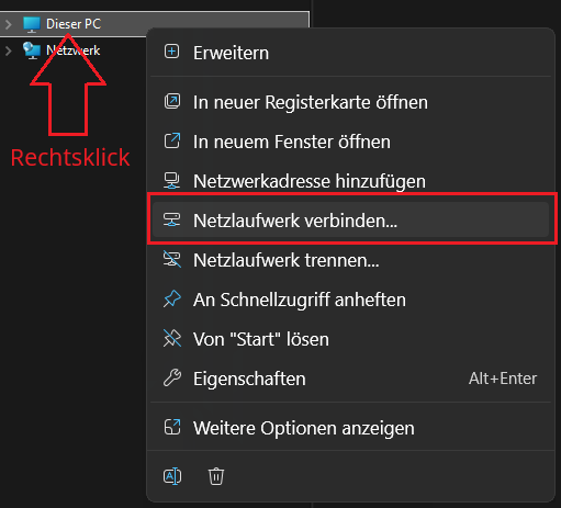 Über diese Schnittstelle kann das PUB-Verzeichnis auch unter Windows als Netzlaufwerk eingebunden werden. Klicken Sie dazu im Windows-Explorer mit der rechten Maustaste auf Dieser PC