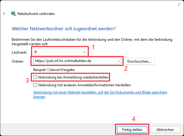 Wählen Sie dann im Anschlussdialog einen Laufwerksbuchstaben (1) und geben Sie als Ordner https://pub.inf.hs-schmalkalden.de an (2). Auf Wunsch können Sie diese Verbindung speichern (3). Bestätigen Sie den Dialog mit Fertig stellen