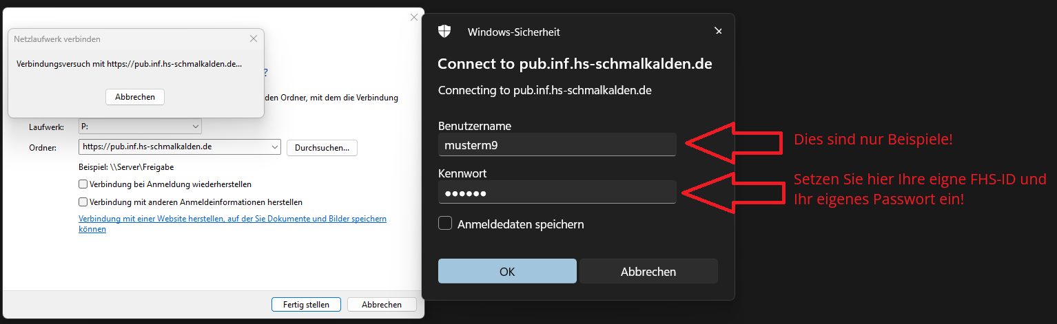 über Windows-Explorer oder CIFS-Mount in UNIX ( Nur bei bestehender VPN-Verbindung! ) - WebDAV: https://pub.inf.hs-schmalkalden.de ( Nur PUB! )