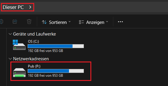 Wenn die Verbindung erfolgreich war, finden Sie das PUB-Verzeichnis als Netzlaufwerk im Windows-Explorer unter „Dieser PC“