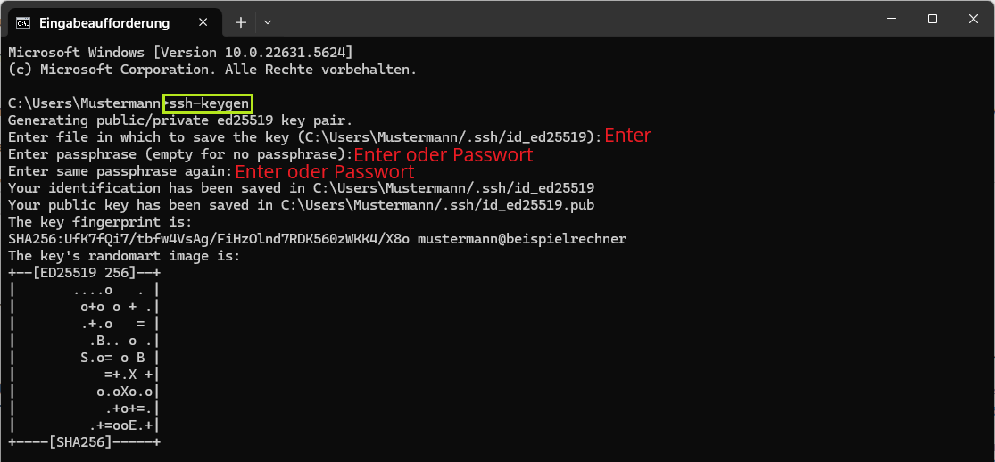 unter Windows bzw. in einem Terminal unter Linux ein. Wenn Sie möchten, können Sie Ihren Private Key mit einem Passwort verschlüsseln.