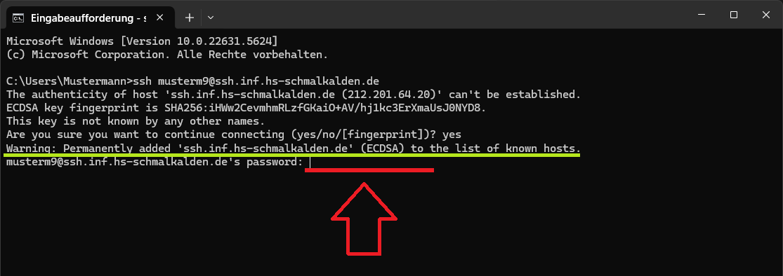 Falls Sie sich zum ersten Mal mit diesem Server verbinden, wird Ihnen nun der Fingerprint des öffentlichen Schlüssels des Servers angezeigt, um Ihnen seine Authentizität nachzuweisen. Vergleichen Sie diese Zeichenkette mit dem exportierten Fingerabdruck im PUB-Verzeichnis, bevor Sie ihn mit yes