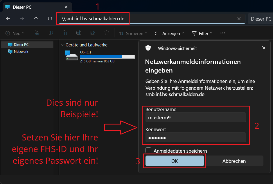 Öffnen Sie den Windows-Explorer und geben Sie in die Adresszeile \\smb.inf.hs-schmalkalden.de (1) und bestätigen Sie mit Enter. Es kann nun einige Sekunden dauern, bis eine Reaktion in Form eines Anmeldefensters erscheint. Geben Sie dort Ihre eigene FHS-ID und Ihr eigenes Passwort ein (2) und bestätigen Sie den Dialog mit dem Button OK (3):