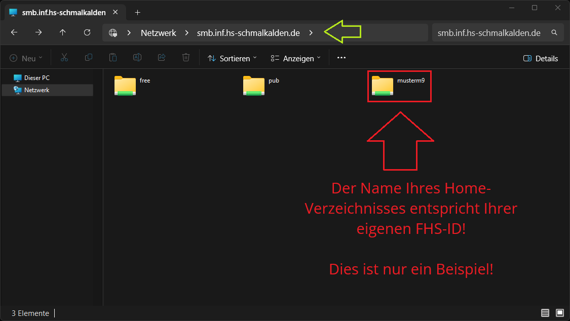 2. SMB ( „Windows-Freigaben“ ): \\smb.inf.hs-schmalkalden.de über Windows-Explorer oder CIFS-Mount in UNIX ( Nur bei bestehender VPN-Verbindung! )