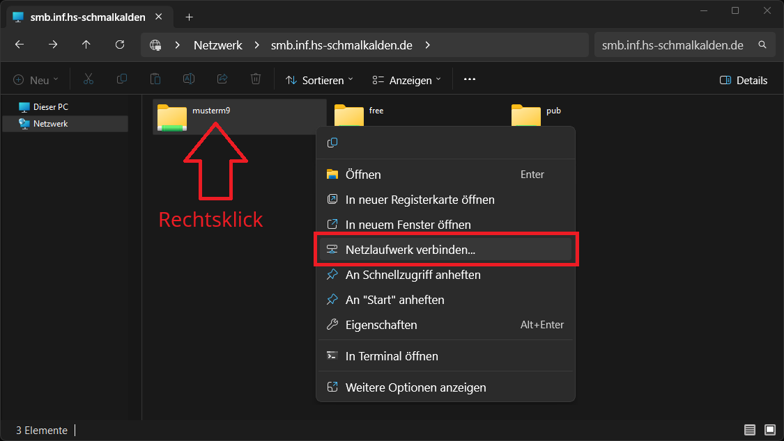 Klicken Sie dazu mit der rechten Maustaste auf eine Freigabe und wählen Sie im Kontextmenü Netzlaufwerk verbinden…:
