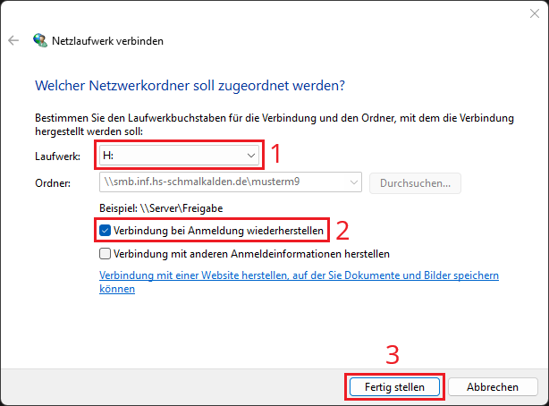 Wählen Sie im Anschlussdialog einen Buchstaben (1) für das Netzlaufwerk. Wahrscheinlich möchten Sie dieses Laufwerk auch dauerhaft speichern (2). Bestätigen Sie den Dialog mit dem Button Fertig stellen (3):