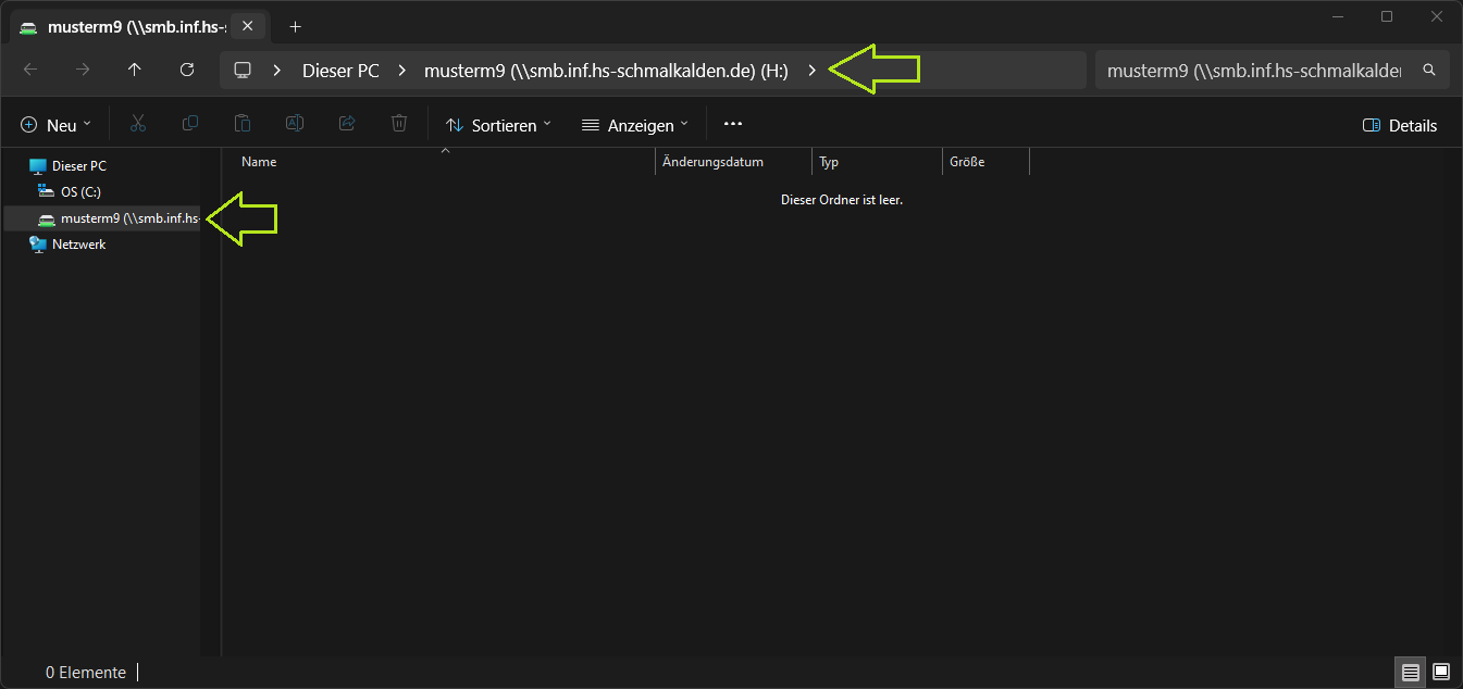 Wenn die Anmeldung erfolgreich war, erkennen Sie dies in der Adresszeile und sehen jetzt alle Netzverzeichnisse als Freigaben („Shares“) auf die Sie Zugriff haben: