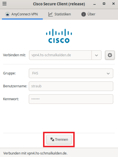- Zum Beenden der VPN-Verbindung öffnen Sie erneut das Programm, z.B. durch Klicken des Cisco Secure Client-Symbols in der Taskleiste.