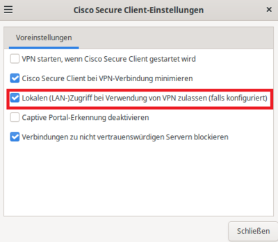- Setzen Sie nun ein Häkchen bei „Lokalen (LAN-) Zugriff bei Verwendung von VPN zulassen (falls konfiguriert)“ um auf Heimressourcen zugreifen zu können. Diese Funktion wird zum Beispiel gebraucht, wenn Sie vom heimischen Umfeld eine VPN-Verbindung aufgebaut haben und gleichzeitig auf einen lokalen Drucker drucken wollen.