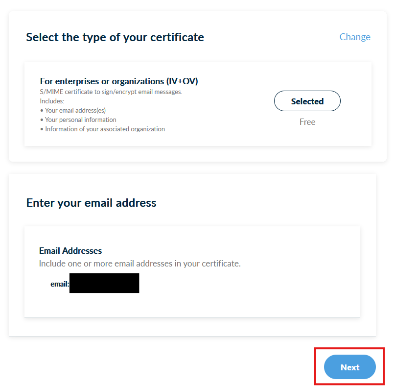 - Überprüfen Sie in der nächsten Ansicht Ihre Auswahl und Ihre E-Mail-Adresse und betätigen Sie „Next“.