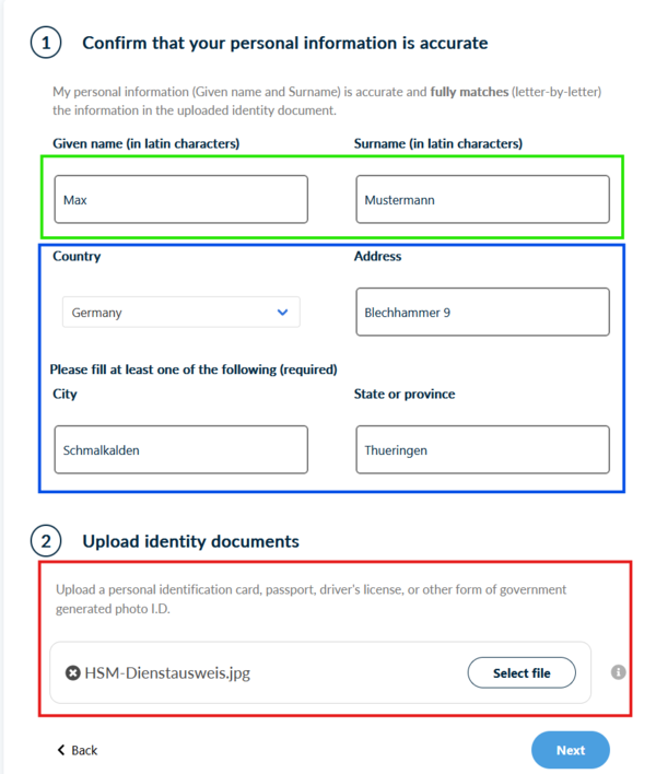 - Laden Sie ein Bild (jpg, png, …) eines Ausweisdokuments (Vorderseite mit Lichtbild z.B. Personalausweis, Führerschein, Thoska) hoch.