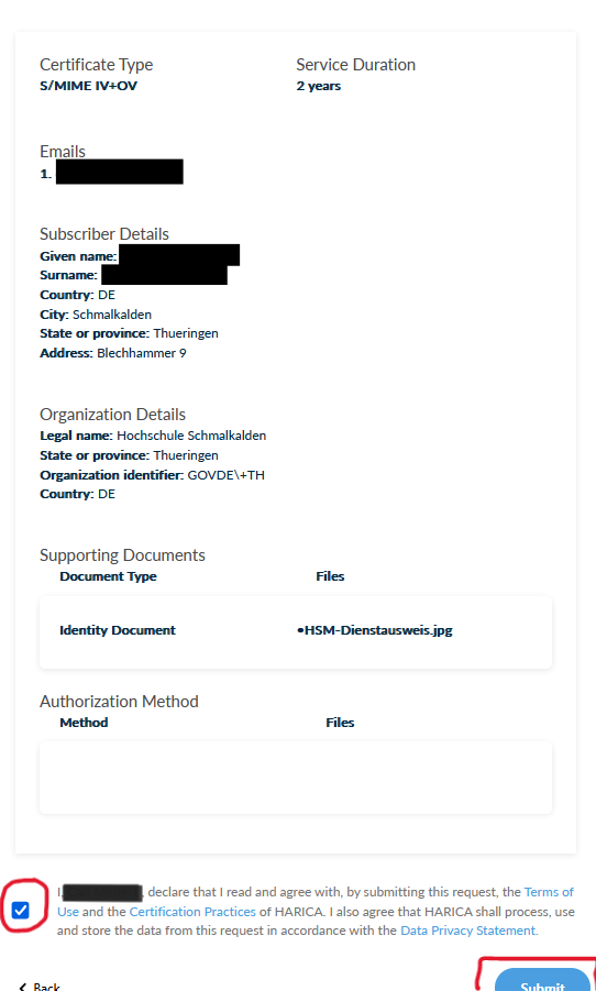- (falls Sie sich zwischenzeitlich bei Harica abgemeldet haben, führen Sie die Schritte zur Anmeldung per „Academic Login / IDP“ erneut aus (s.o.))