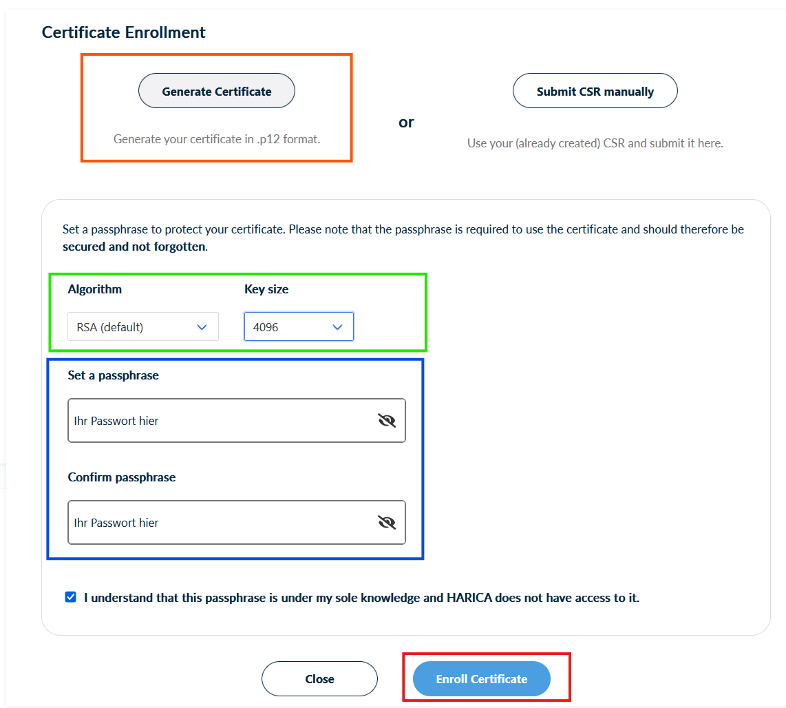 - Setzen Sie den Haken für die Inforation, dass selbst Harica dieses Passwort nicht einsehen kann