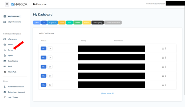 Serverzertifikate können von allen Mitarbeitern über Harica beantragt werden. Es obligt den Administratoren (pki@hs-schmalkalden.de) diese Anträgen auch zu genehmigen. Bitte bei neuen Serverzertifikaten den Administratoren vorab Bescheid geben, dann können Missverständnisse vermieden und der Vorgang beschläunigt werden.