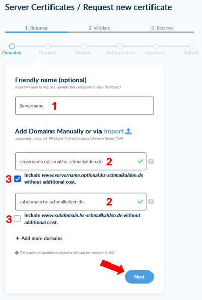 - wählen Sie, ob die jeweilige Domain zusätzlich mit „www.“ im Zertifikat enthalten sein soll 3